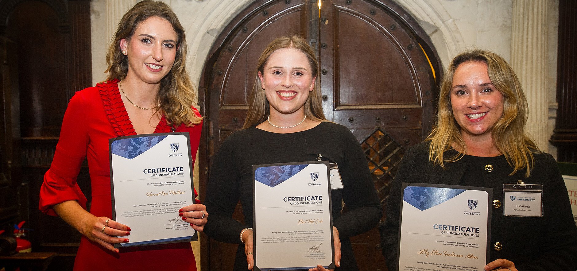 Porter Dodson is proud to announce that three of our newly qualified solicitors recently attended the Devon and Somerset Law Society (DASLS) Admission Ceremony at the historic Guildhall in Exeter. The event, presided over by DASLS President Stephen Forsey, celebrates the official admission of solicitors to the profession and their membership in the Law Society, with official certificates presented to the trio by His Honour Judge Walsh.